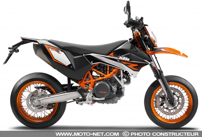 "Ce qui est absent ne pèse rien : c'est selon cette devise que la nouvelle 690 SMC R a été développée. Un monocylindre prêt à en découdre, un cadre solide uniquement entouré des composants essentiels... C'est tout ce qu'il faut pour prendre du plaisir sur route ou piste. Et c'est ainsi que l'on atteint un poids sensationnel de seulement 140 kg. Même les chambres à air ont été éliminées, grâce aux roues à rayons avec pneus tubeless développés spécialement. La réduction de poids ainsi obtenue permet aux suspensions WP entièrement réglables d'être encore plus efficaces".