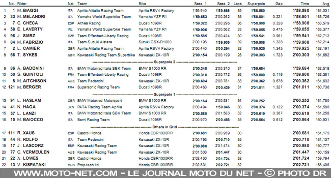Heureusement pour le spectacle, les trois adversaires de Biaggi - qui se sont partagé les victoires cette année - s'élanceront eux aussi de la première ligne ! Les deux rookies Yamaha, Marco Melandri et Eugene Laverty, encadrent dans cet ordre le leader du championnat Carlos Checa.