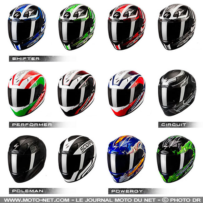 Fleuron de la gamme Scorpion, l'Exo 2000 Air propose quatre tailles de calotte (XS, S/M, L et XL/XXL) pour une meilleure ergonomie et décline déjà en de multiples versions et coloris (voir photo ci-dessous).