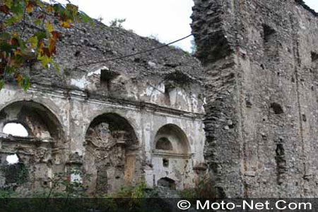 A chaque arrêt, moteur coupé, on est surpris par le silence qui règne. Passé le Col d'Arcarotta, changement de décor : nous sommes passés sur le flanc est de la montagne et c'est beaucoup, beaucoup plus humide et glissant... A tel point qu'aux alentours de Nocario, nous roulerons carrément dans les nuages. On se serait bien arrêtés à Piedicroce, mais ce jour-là il y a une manifestation très officielle et la foule des grands jours... On se console en s'arrêtant près des ruines du Couvent de Piedicroce. Fondé en 1493, détruit par une explosion en 1943, il a été le lieu de la rencontre entre Napoléon 1er et Pascal Paoli en 1790.