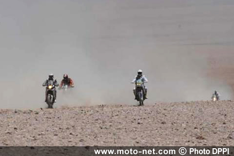 Premier à partir hier matin, Marc Coma a parfaitement assumé son rôle d'ouvreur : impérial tant en pilotage qu'en navigation, l'espagnol a engrangé jusqu'à 32 secondes d'avance sur cette étape qui allait de San Salvador à Calama. Les concurrents sont passés de l'Argentine au Chili via les hauteurs (jusqu'à 4800 mètres !) de la Cordillère des Andes.