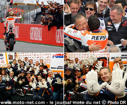 Comme lors de chacun de ses succès, Marc Marquez a tenu à le partager avec toute son équipe, dont certains portaient des gants marqués du chiffre "13" pour célébrer sa 13ème victoire ! Une fois n'est pas coutume, Shuhei Nakamoto, vice-président du HRC (dans les bras de Marquez ci-dessus), a donné quartier libre aujourd'hui à son prodige ainsi qu'à tous ses équipiers, alors que les premiers tests 2015 ont débuté ce matin.