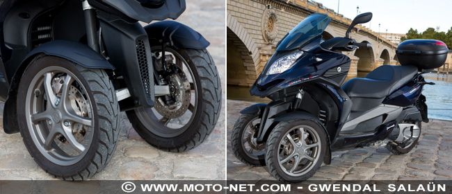 Bien qu'amélioré, le comportement du Quadro 350S tranche avec la relative vivacité d'un train avant de MP3, doté de roues plus fines et petites (12/13 pouces selon le modèle), moins écartées et associées à un système de bascule différent.