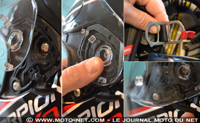 Petit plus hyper pratique, sur route mais aussi sur circuit : un mécanisme accessible en roulant permet d'entrouvrir l'écran en position "filet d'air" ou de le verrouiller solidement. Le motard "pistard" appréciera la présence de fixations servant à installer des tear-off, ces fins films transparents à superposer au-dessus de l'écran et que l'on décolle un par un pendant le roulage pour conserver un champ de vision parfaitement propre.