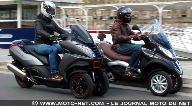 Même si ce Metropolis n'est encore qu'une présérie, nous ne pouvions le tester dignement sans le comparer à la référence du marché qui est aussi sa cible désignée : le Piaggio MP3 500 LT. Si 100 ccc (94 en réalité) les séparent, ils sont affichés à peu près au même prix (à 100 euros près) et se valent en termes de puissance (37,2 pour le Peugeot contre 40,1 ch pour le Piaggio).