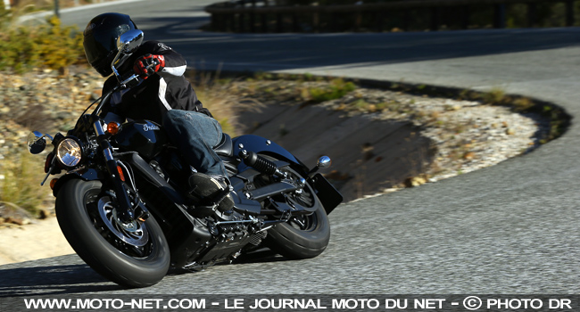 Les deux gros boudins sont montés sur des jantes de 16 pouces et l'angle de chasse est contenu pour un custom (29°), si bien que la moto se révèle très maniable. Le train avant n'est jamais tombant et évite ainsi toute - mauvaise - surprise aux motards qui n'ont jamais chevauché de moto américaine.