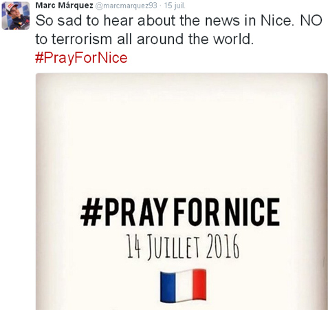 Marc Marquez, comme beaucoup d'autres pilotes, y exprime sa tristesse face à cette folie meurtrière et condamne le terrorisme partout dans le monde.