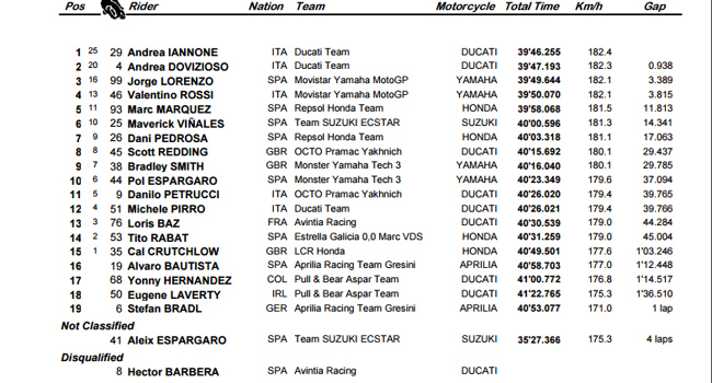 Arrivée : Iannone maintient et augmente même son avantage jusqu'au drapeau à damier, franchissant la ligne d'arrivée avec 0,938 sec d'avance sur Dovizioso ! L'italien offre à Ducati sa première victoire en MotoGP depuis le Grand Prix d'Australie 2010, soit presque cinq saisons et demie de disette pour les Rouges : sacré chemin de croix !