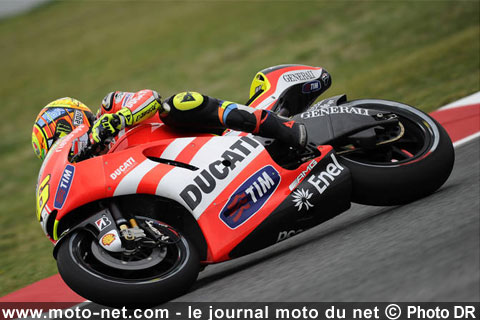 Victime d'une chute dans le denier quart d'heure de la séance (perte de l'avant à l'entame d'un gauche), Valentino Rossi termine ces essais libres à 1,673 sec de la pole : un gouffre ! Détenteur du plus beau palmarès à Montmelo (13 podiums consécutifs dont six victoires), l'Italien ne semble pas vraiment progresser dans son approche de la Desmosedici, malgré ses déclarations volontairement optimistes.