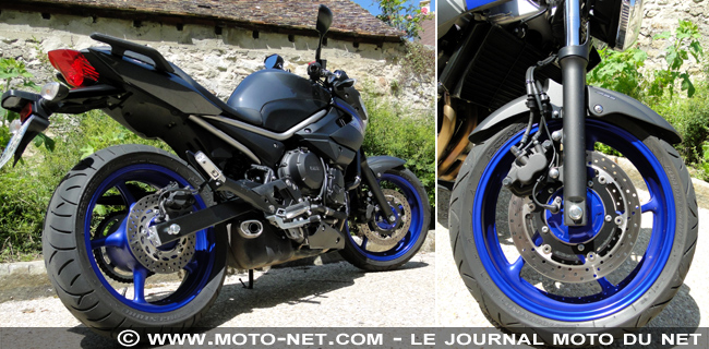 Le cadre de la XJ6 est de type "diamant"... mais en acier - pas en diamant... - comme celui de la CB650F. Sa fourche télescopique "non-inversée" n'a rien à envier à celles de ses concurrentes du jour. En revanche, ses deux disques avant sont un peu plus petits (298 mm) et mordus par des étriers 2-pistons (4 sur la Honda).