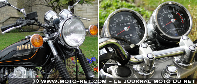 Les plus tatillons pourront le vérifier par eux même : la SR400 est majoritairement faite de "bon gros" métal, à l'image des garde-boue, pare-chaîne, phares, cuvelage de compteurs et rétroviseurs généreusement revêtus de chrome... Seuls les supports de clignotants sont en plastiques, mais ils ne dépareillent pas.