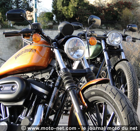 Par conséquent, difficile de profiter de sa garde au sol pourtant supérieure à celle de la Yamaha pour prendre l'ascendant : la XV950R a beau joyeusement frotter dans chaque virage, elle s'y montre plus saine et rigoureuse. Et comme son bicylindre de 942 cc (soit 59 cc de plus que l'Iron 883) développe un supplément de couple non négligeable (79,5 Nm à 3000 tr/m contre 70 Nm à 3750 tr/mn), la Japonaise conserve l'avantage en sortie.