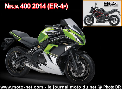 Lancée en 2010, la Ninja 400 est une petite copie d'un des best-sellers des Verts : l'ER-6f (dénommée Ninja 650 aux États-Unis, au Canada et au Japon, notamment). Celle qui s'appellerait "ER-4f" si elle était importée en Europe est construite sur la base du roadster ER-4n que Kawasaki commercialise depuis un peu plus de trois ans dans certains pays.