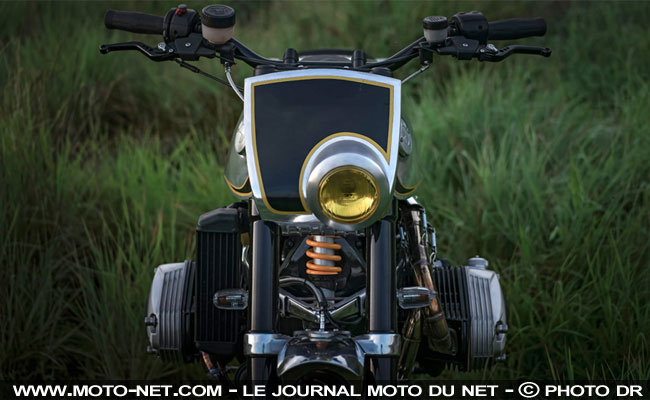 Enfin, la tête de fourche accueille un unique phare rond jaune, dont le volontaire décalage vers la gauche fait clin d'oeil à l'asymétrie souvent utilisée dans la production BMW. Notez aussi au passage le guidon moins relevé qu'à l'origine et le court garde-boue avant chromé... sans doute peu efficace en cas de pluie, mais tellement raccord avec l'allégement général !