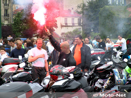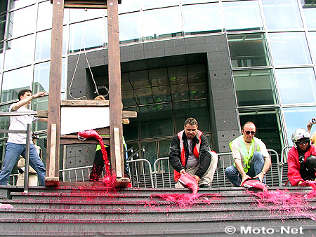 Toutes banderoles dehors - "Partageons la route", "La sécurité c'est pas les PV", "Non au racket routier" et "Robien, la sécurité... des rentrées fiscales" -, le cortège s'est ensuite dirigé vers la Bastille pour ériger une guillotine sur les marches de l'Opéra. Et le sang coula, longuement, recouvrant lentement le grand escalier sous l'oeil médusé des touristes en goguette, tandis que les motards observaient une minute de silence, leurs casques brandis vers le ciel, à la mémoire de "tous les copains qui sont tués sur la route"... Les manifestants ont ensuite crucifié un mannequin sur des rails de sécurité devant l'Assemblée nationale en enflammant des casques, tandis qu'une délégation se rendait à l'Elysée pour demander un rendez-vous au président de la République.