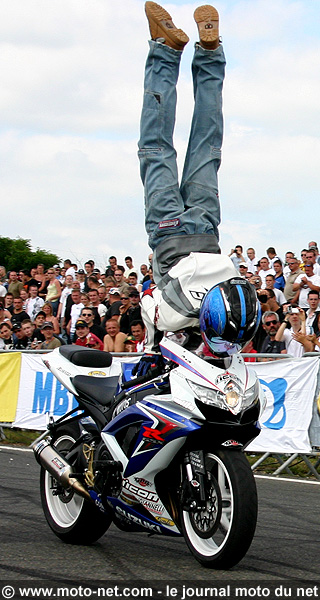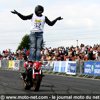 La météo favorable et le soutien d'un public parisien chaleureux, venu en nombre assister au Stunt Bike Show 2008, ont permis à Manu de Nice de réaliser sa célèbre figure : le Face Skitching au cours duquel il glisse devant la moto ! Interview et vidéos.
