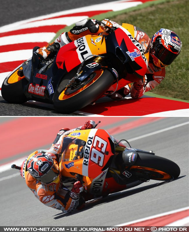 Une analyse plutôt sensée de la part du jeune prodige du MotoGP (huit podiums dont trois victoires en neuf courses !), d'autant que Casey Stoner et lui ont en commun un style de pilotage assez similaire. Comme l'Australien, Marquez est très mobile et se sert énormément du haut de son corps pour aider sa moto à aller - et rester ! - au point de corde : il suffit de jeter un oeil à notre montage ci-dessous pour s'en apercevoir (en haut : Stoner au GP de Catalogne 2012. En bas : Marquez au GP des Amériques 2013) !