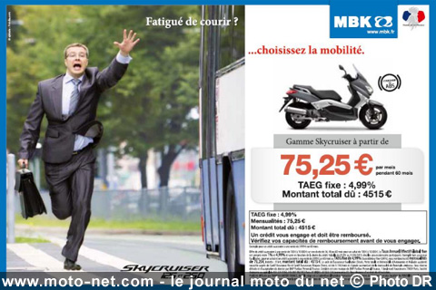 MBK vient de lancer une offre de financement sur toute sa gamme de Skycruiser, valable jusqu'à fin mai 2013. Le constructeur français propose en outre quelques promotions sur ses modèles 2011 et 2012 identiques à ceux de 2013...