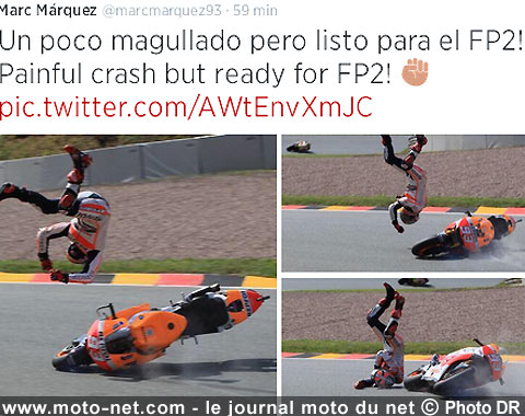 Outre un talent inouï, le nouveau prodige du MotoGP Marc Marquez possède de véritables dons d'équilibriste lui permettant de rétablir des situations "cata" d'un coup de coude bien placé ou d'une remise des gaz salvatrice. Mais parfois cela ne suffit pas, comme lors des premiers essais au Sachsenring durant lesquels il est parti en high side dans le virage n°1.