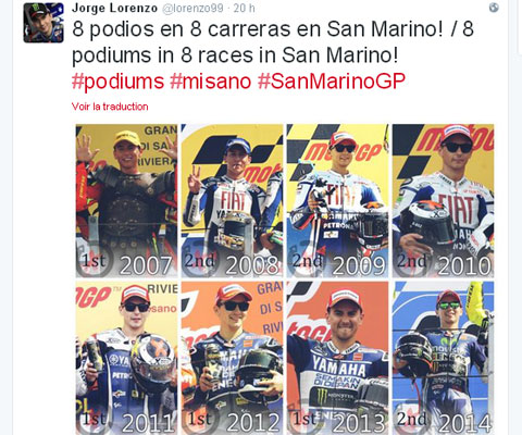 "Je suis maintenant concentré sur la course de Misano parce que c’est une piste spéciale pour nous et pour Yamaha. Je sais que Valentino se sent bien là-bas parce que c’est son Grand Prix à domicile, mais j’ai toujours été assez rapide là-bas et j’y ai remporté plusieurs victoires (pour l'illustrer, Lorenzo a publié sur Twitter le montage ci-contre afin de rappeler qu'il compte huit podiums consécutifs à Misano, NDLR).