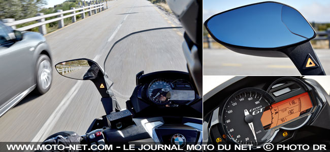 Les cadrans de l'instrumentation jouissent aussi d'un lifting et intègrent un nouveau témoin : celui de l'anti-patinage ASC désormais installé de série sur les deux modèles en plus de l'ABS, comme sur le scooter électrique C Evolution. Le C650 GT y ajoute même un équipement installé pour la première fois sur un deux-roues : un assistant d'angle mort side view assist (SVA).