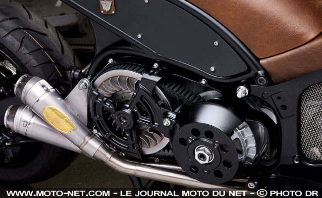 Méritant totalement son appellation "Hyper Modified", ce Tmax fait la part belle aux matériaux nobles (qualité de la selle en cuir, finition des diaboliques sorties d'échappements...) et joue la carte du minimalisme. Le designer californien a viré tout le superflu afin de mettre en évidence le châssis en aluminium de la star des maxi-scooters sportifs : c'est juste beau !