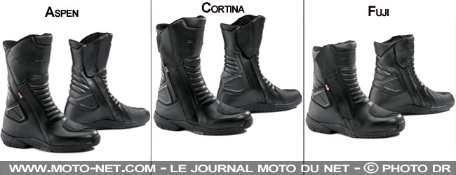 Trois nouvelles paires de bottes en cuir pleine fleur et au profil routier étrennent cette technologie à partir de 2014 : la Cortina (fermeture par deux zips et deux scratchs, protections chevilles et tibias et renfort sélecteur, doublure interne rembourrée : 209,90 €), l'Aspen (fermeture par un zip et un velcro, protections chevilles et tibias et renfort sélecteur, doublure interne rembourrée : 179,90 €) et la Fuji, une botte un peu plus urbaine grâce à sa construction à tige plus courte (179,90 €).
