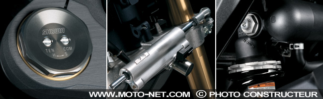À l'arrière, le filetage du réglage de précharge de l'amortisseur est désormais fabriqué en alu anodisé, ce qui permet une baisse de poids de 90 g... Ils sont fous ces Japonais ? Non ! "Le ressort lui-même est plus léger de 200 g et les nouvelles biellettes sont plus légères de 490 g", précise Suzuki.