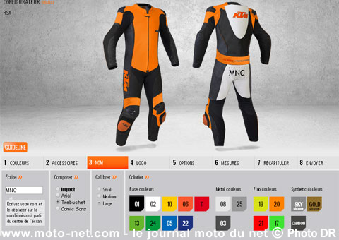 En quelques clics sur le configurateur en ligne, il est tout d'abord possible de définir les coloris des différentes parties de la combinaison, puis d'ajouter son nom et le logo d'une des motos de la marque (Duke, Superduke 1290 ou RC8). L'étape suivante permet de choisir entre une confection en cuir de vachette pleine fleur ou de kangourou, d'adopter ou non la bosse dorsale et de sélectionner les zones de micro-perforations servant à l'aération.