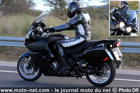 Sur les clichés "volés" par nos confrères britanniques, la routière Triumph de grosse cylindrée adopte une longue sortie d'échappement latérale, une fourche inversée et une transmission finale par cardan. Et surtout des lignes qui ne sont pas sans rappeler la plébiscitée BMW R 1200 RT, notamment dans le dessin de la partie avant dans laquelle les rétros sont intégrés près du double optique.