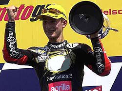 Lorenzo tient bon jusqu’à la ligne d’arrivée et s'offre son premier podium, sur la plus haute marche et avec la manière ! A 16 ans, ça promet pour la suite de sa carrière ! Stoner et De Angelis complètent le tableau, Pedrosa finissant 4ème mais une fois de plus devant ses adversaires les plus menaçants au championnat dont Perugini, 7ème. Arnaud Vincent termine finalement à la 13ème place, très déçu.