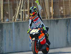 Au 20ème tour, Rossi a presque 4 secondes d’avance sur Gibernau, 8 sur Tamada, 10 sur Biaggi qui a réussi à lâcher Hayden à 6/10ème... Autant dire que le podium est connu, sauf grosse surprise ! Rien ne change lors des quatre derniers tours, sinon que Rossi, au fur et à mesure qu’on approche de l’arrivée, fait de plus en plus de spectacle et multiplie ses glisses légendaires pour régaler le public ! Dans le genre, son dernier tour sera un modèle du genre, Vale faisant même fumer sa roue arrière à la façon des Ducati lors de glisses volontairement entretenues... Un artiste ! A noter que Nakano et Checa passent Bayliss lors du dernier tour. Victoire donc de Rossi, sa 6ème d’affilée à Rio, devant Gibernau et Tamada qui fait monter Bridgestone sur le podium pour la première fois ! Biaggi se contente de l’accessit de la 4ème place devant Hayden qui progresse très régulièrement. 18 podiums d’affilée pour Rossi, qui égale ainsi le record d’Ago !
