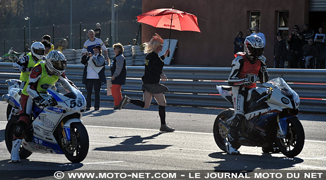 Sur la grille, les umbrella girls grolandaises du team Moto-Net.Com sont aux côtés du Chevalier et c'est le départ (Moon la blonde a tout juste le temps de déguerpir !)