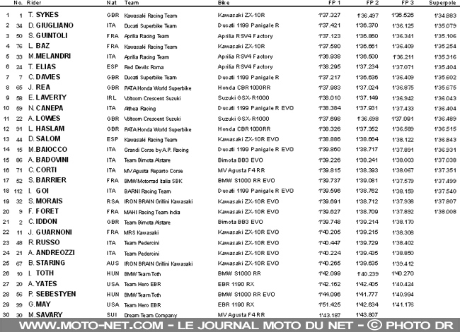Le troisième rang est occupé par le Gallois Chaz Davies (Ducati SBK Team), le Nord-Irlandais Jonathan Rea (Honda Pata) et l'Irlandais Eugene Laverty (Suzuki Voltcom Crescent). Les trois cousins de l'Anglais Tom Sykes seront eux aussi à surveiller de près durant les deux courses de demain : premier départ à 10h30, n'oubliez pas !À l'instar de Giugliano, Canepa mérite une salve d'applaudissements ! Niccolo a en effet réussi à hisser sa Ducati configurée en "Evo" à la 10ème place de "sa" grille nationale. Le n°59 du Team Althea précède Alex Lowes (Suzuki Voltcom Crescent) et Leon Haslam (Honda "Pata... tra", puisque le n°91 est tombé à deux minutes de la fin !).