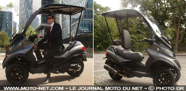 La société française Scodiam , basée à Colombes (92), commercialise depuis mi-novembre un astucieux équipement de protection composé d'un toit et d'un pare-brise rigides pour les scooters à trois-roues Piaggio MP3 .