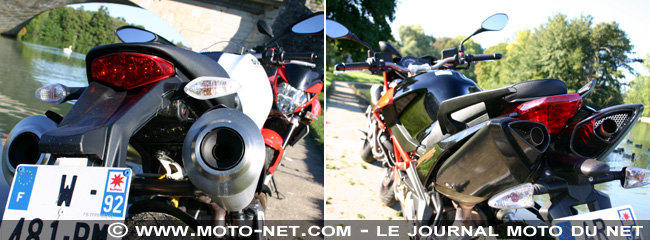 La nouvelle Ducati se différencie en revanche largement de la Shiver par son monobras arrière - celui du Monster 1100 -, sa finition un peu plus léchée et son look, plus éloigné de ceux des japonaises par rapport à l'Aprilia. Ceci dit, les pots de la Monster ne sont pas sans rappeler ceux des Yamaha MT-01 ou MT-03 !