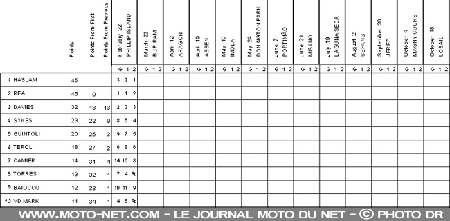 Derrière, Torres passe enfin Sykes et s'éloigne rapidement de lui. Guintoli est un peu plus loin en septième position. Doublé par Terol, De Puniet occupe la neuvième place. Barrier et sa BMW se trouvent en 15ème position, Ponsson et sa Kawasaki en 18ème.