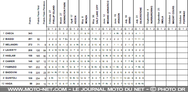 Après sa chute en première manche à Aragon, Checa avait préféré assurer trois 3èmes places derrière Biaggi et Melandri. Cette fois à Silverstone, l'Espagnol s'est montré impérial et reprend le large au championnat : il totalise 343 points, contre 281 pour Biaggi et 272 pour Melandri.