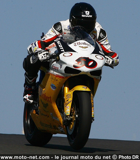 Au deuxième passage devant les stands, Sylvain hisse sa 1098 devant la Fireblade n°4 et conserve la tête au premier freinage. En arrière plan, on voit une Aprilia officielle partir tout droit dans ce même virage : il s'agit de la n°2 de Camier.