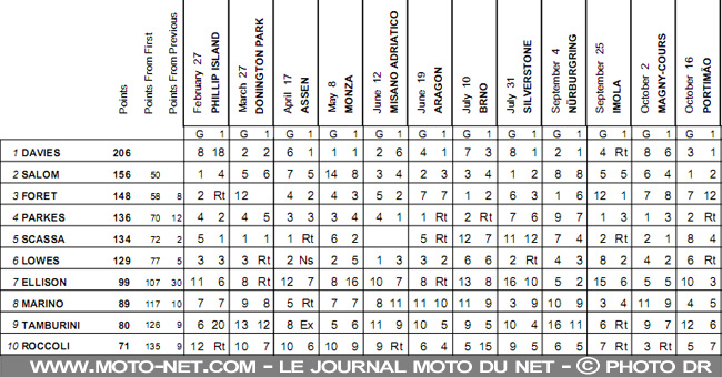 Chaz Davies achève donc sa superbe saison avec une sixième victoire et un total de 206 points. David Salom profite de ses 20 points supplémentaires pour décrocher le "titre" de vice-champion (156 pts) devant Fabien Foret (148), Broc Parkes (136) et Luca Scassa (134).