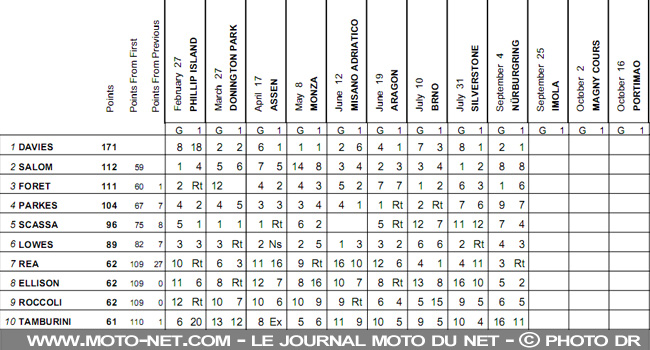 Fort de sa 5ème victoire - en 9 courses ! -, Chaz Davies s'envole au provisoire : le pilote Yamaha cumule 171 points, contre 112 pour Salom, 111 pour Foret et 104 pour Parkes. Du côté des constructeurs, Yamaha porte son avance à 32 points face à Honda (201 points contre 169). Kawasaki est 3ème avec 145 points, Triumph ferme la marche avec 24 petits points.