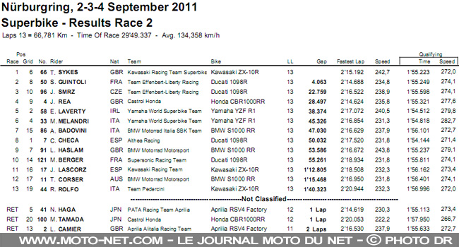 Le drapeau rouge est finalement agité à 6 tours de la fin et permet à la nouvelle ZX-10R de remporter sa première victoire en World Superbike ! Les deux Ducati du team Effenbert de Guintoli et Smrz complètent le podium, devant la Honda "customisée" de - et par ! - Rea.