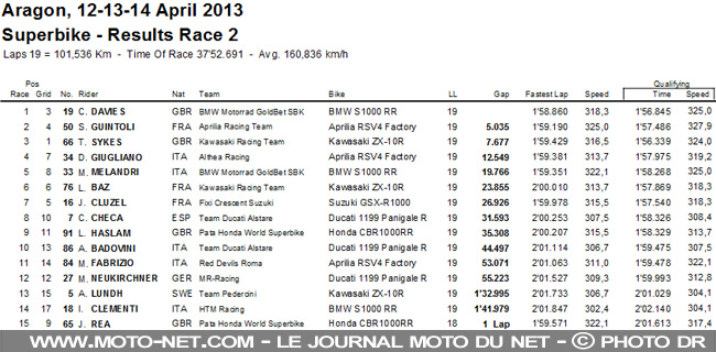 Chaz Davies a survolé la deuxième épreuve du World Superbike 2013 ce dimanche à Aragon ! Mais Sylvain Guintoli n'a pas failli : il empoche de nombreux et précieux points qui le maintiennent en tête du championnat du monde.