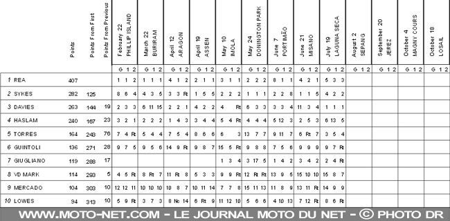 Arrivé aux États-Unis avec 133 points d'avance sur Sykes, Rea voit son avance réduite de huit points : 125, soit cinq victoires. Tombé en première manche et battu par son coéquipier en seconde, Haslam perd à Laguna Seca de précieux points et se fait doubler par Davies au provisoire...