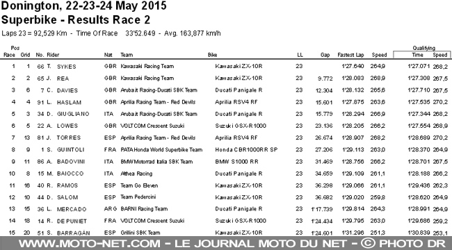 Il faut attendre le 19ème tour pour voir Tom Sykes perdre un peu de terrain sur ses adversaires : le King de Donington Park compte cependant près de neuf secondes d'avance sur son coéquipier Jonathan Rea. Ce dernier est contraint de continuer à attaquer pour prévenir tout retour de Chaz Davies en fin de course...Leon Haslam reprend à Giugliano la quatrième place à la fin du 21ème tour, au freinage des Fogarty Esses. Alex Lowes est quasiment assuré de terminer sixième. Sylvain Guintoli en revanche doit contenir les attaques de Jordi Torres : le rookie bute sur le champion du monde mais trouve l'ouverture dans l'ultime boucle !