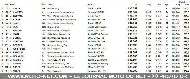 Septième meilleur temps derrière Jakub Smrz, le duo Jonathan Rea - Fireblade devance Leon Haslam et sa S1000RR de seulement deux centièmes de seconde ! Les deux sujets de Sa Majesté Elizabeth II, à l'instar de leurs compatriotes Laverty et Sykes, effectuent une belle fin de saison et devraient animer le peloton dimanche.