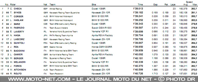 Tournant juste une demi-seconde moins vite que Checa, Maxime Berger occupe la 11ème place. Espérons que le local de l'étape maintiendra cette position demain, afin de participer une nouvelle fois à l'épreuve de Superpole qui délivre, petit à petit, les places sur la grille de départ... Rendez-vous demain pour la suite du World Superbike à Magny-Cours sur Moto-Net.Com !