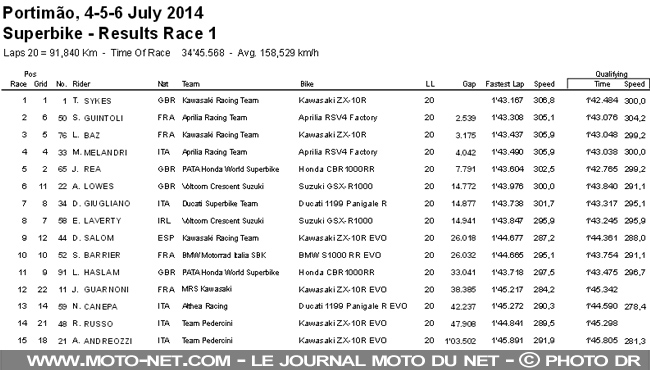 Chahuté en début de course, Tom Sykes a maté ses petits camarades ce midi sur le circuit de Portimao. Le Ninja anglais enregistre son 21ème succès en WSBK, soit autant que Biaggi. Sylvain Guintoli et Loris Baz l'accompagnent sur ce premier podium portugais 2014. Première course Superbike Tom Sykes se fait croquer par Jonathan Rea et Marco Melandri dans la…