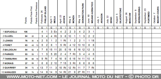Kenan Sofuoglu augmente son avance au championnat : il possède désormais 106 points, sur les 125 mis en jeu lors des six manches disputées. Jules Cluzel grimpe en 2ème position (94 points) devant Lowes (76), Foret (63) et Baldolini (54).