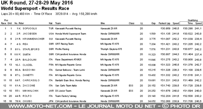Signalons enfin que le champion de France, Cédric Tangre, termine 26ème de cette course anglaise aux commandes de l'unique Suzuki du plateau. Dans "sa" catégorie Superstock 600, Zaccone et Mikhalchik sont les seuls à marquer des points (respectivement 4 et 3).